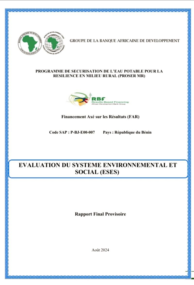 Eau, BéninLe Bénin s’est fixé un objectif ambitieux : garantir un accès universel à l’eau potable d’ici 2026 en milieu rural. Le Programme de Sécurisation de l’Eau Potable pour la Résilience en Milieu Rural (PROSER MR) représente une réponse directe à cet enjeu crucial. Cependant, une récente Évaluation du Système Environnemental et Social (ESES) dévoile les défis majeurs à surmonter pour atteindre cet objectif.