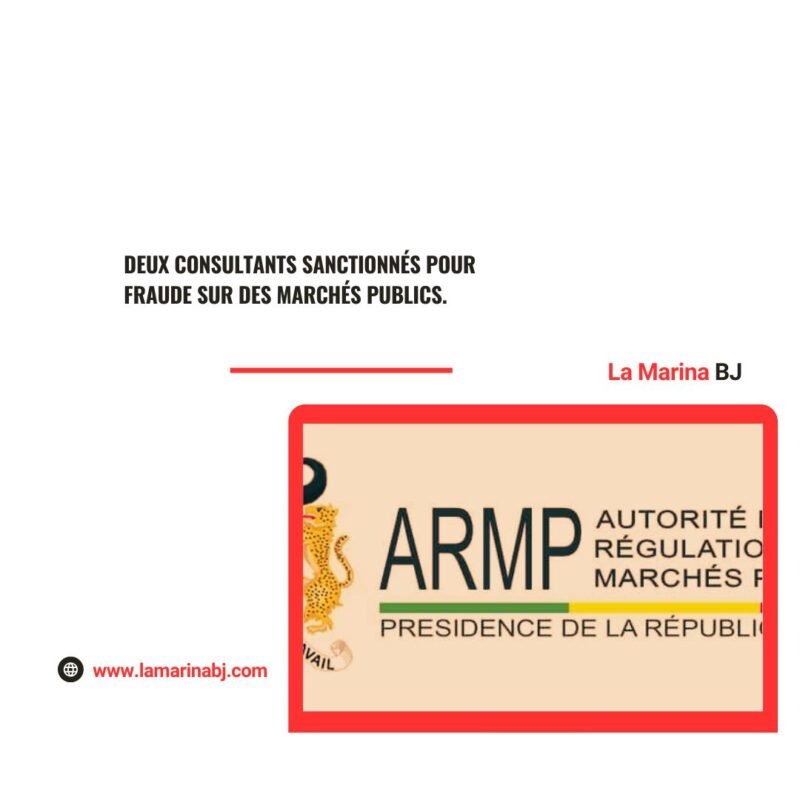 Commande publique, BéninL’Autorité de Régulation des Marchés Publics (ARMP) a prononcé, le 20 février 2025, une sanction exemplaire à l’encontre des consultants Djinadou R. O. A. et Chabi B. I. H. Reconnaissant la production de fausses références professionnelles, ces derniers sont désormais exclus de la commande publique pour une durée de cinq ans.